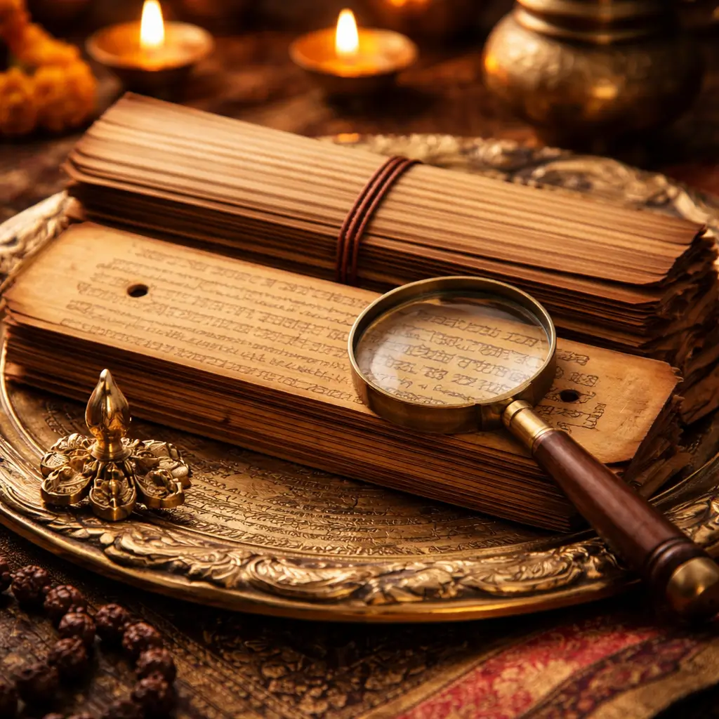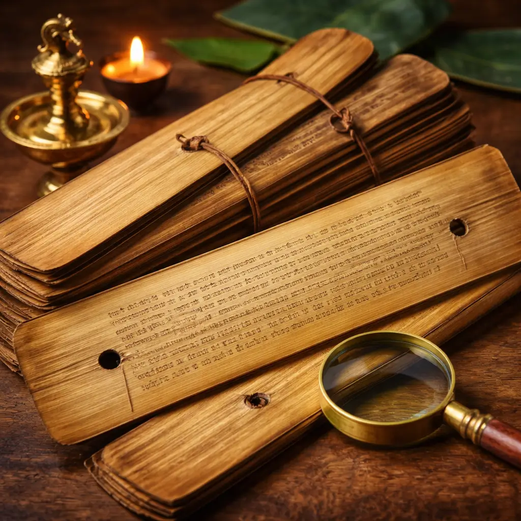These palm leaves have been carefully preserved for generations by traditional Nadi astrology families, especially in Tamil Nadu.
