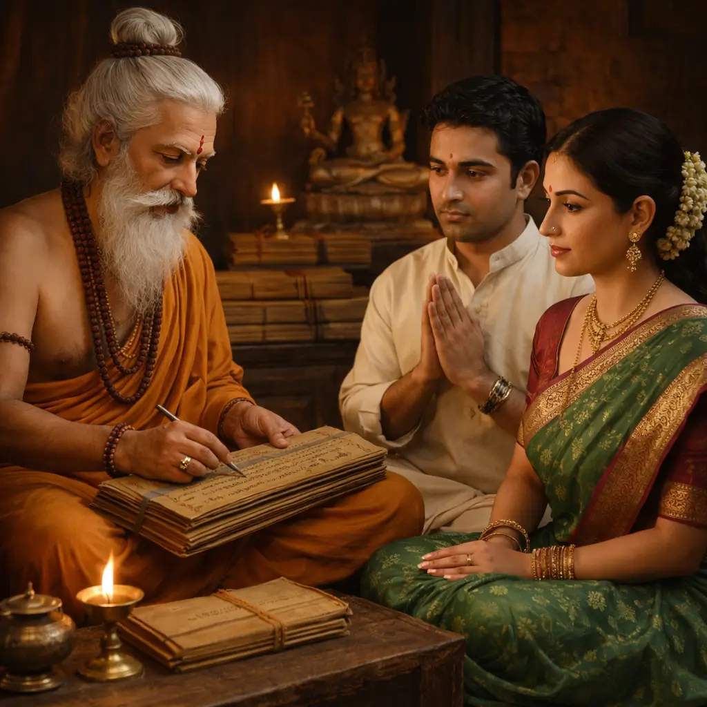 The leaves were written on dried palm leaves in old Tamil script. Sages like Agasthiya used their spiritual knowledge and meditation to record important details about a person’s life, including name, parents’ names, career, marriage, children, challenges, and remedies.